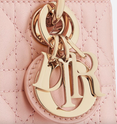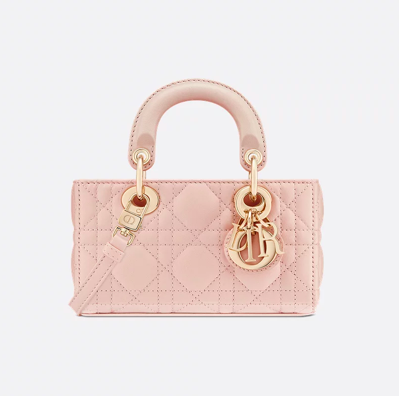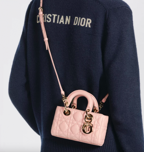 (图注:左:胭脂粉Lady D-Joy超迷你手袋正面展示,缀金色金属拎环与饰件,彰显精致优雅。中:细节展示,光影下尽显Dior品牌的精致工艺与奢华质感。右:藏蓝Dior毛衣模特斜挎胭脂粉Lady D-Joy超迷你手袋,造型简约,对比鲜明,尽显品牌格调。)