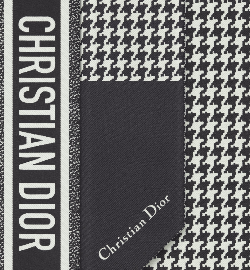 (图注:丝巾束在手腕上特写,丝巾细节特写,清晰展示千鸟格纹与"CHRISTIAN DIOR"提花字样)