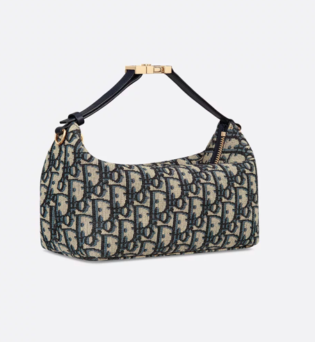 (图注:左:DiorTravel Nomad手拿包整体展示,蓝色Oblique印花面料,配黑色皮革手柄与金色扣环,设计典雅大气。中:手拿包细节展示,玫瑰金CD锁扣连接深蓝饰带,置于经典Oblique提花之上,细节尽显奢华。右:手拿袋搭配展示,模特手持Dior手袋,造型简约,优雅随性。)