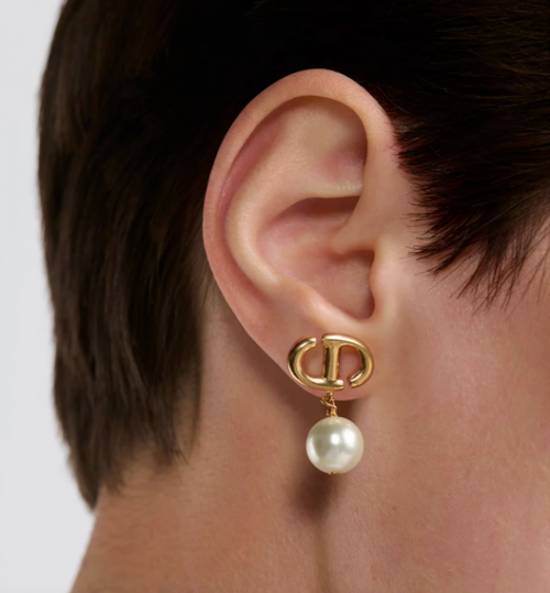 这对耳环设计优雅精致,金色饰面金属打造的CD标志,与点缀的白色树脂珠饰相得益彰。它既是配饰,也可以成为情感载体。