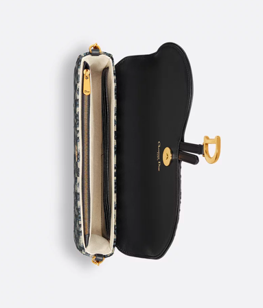 (图注:左:展示马鞍链条手袋正面全貌,蓝白Oblique印花,黑皮镶边,金色“D”字吊饰与链条,造型经典奢华。中:展示马鞍链条手袋内部结构。右:展示中号马鞍链条手袋细节与搭配,Dior经典元素在紧凑构图中彰显精致奢华)