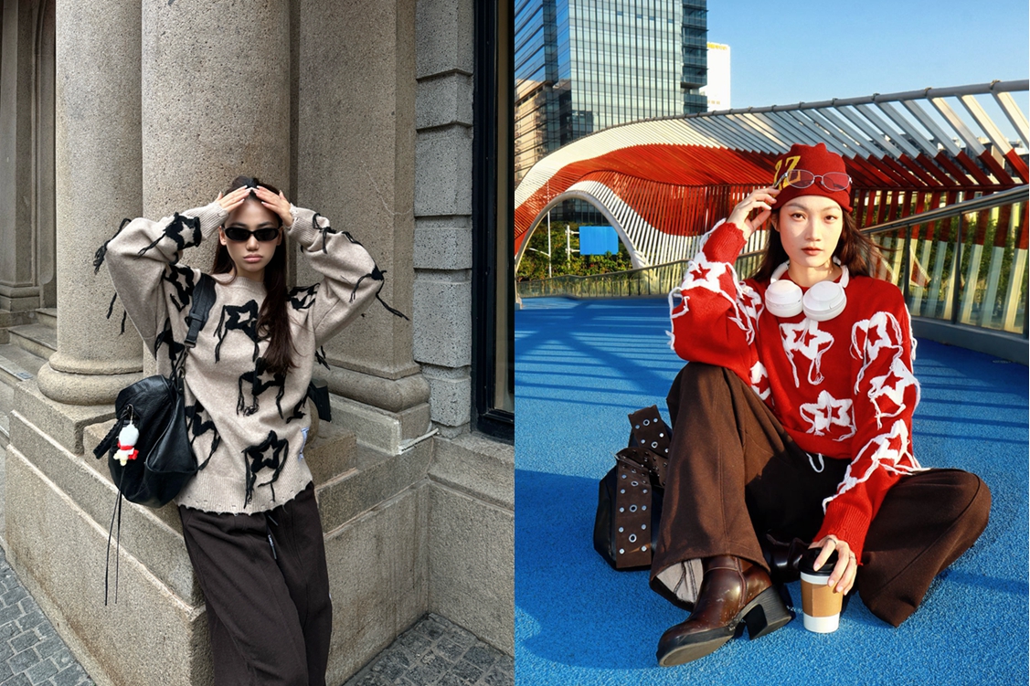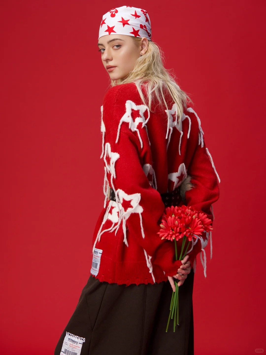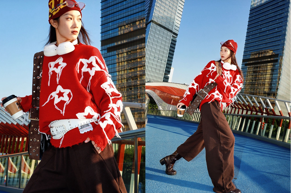 而此次2026早春的星星毛衣,正是品牌新定位下的产物——撷取象征新年的绯红与璀璨星芒为灵感,将节日的热烈氛围与品牌的随性反叛相融合。不规则流苏星星的设计,既保留了品牌一贯的“不按常理出牌”,又让星芒元素脱离了刻板的装饰感;绯红底色则精准踩中新年穿搭的氛围感,让潮酷单品也能适配节日场景。