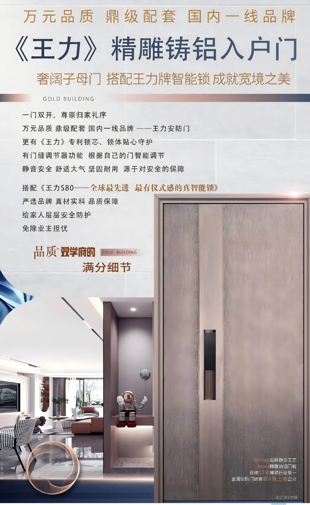 浙江金华名筑项目:以王力精雕铸铝子母门为品质标签,宣传中直接打出“高端铸铝门首入本地”,成为项目一大卖点;