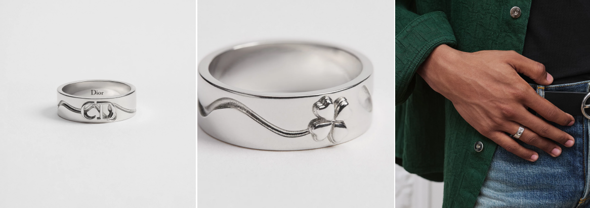 图注:Dior Trèfle戒指(产品编号:R2749HOMST_D990),银质宽版设计,将经典三叶草幸运符与镂空CD标志创新融合。