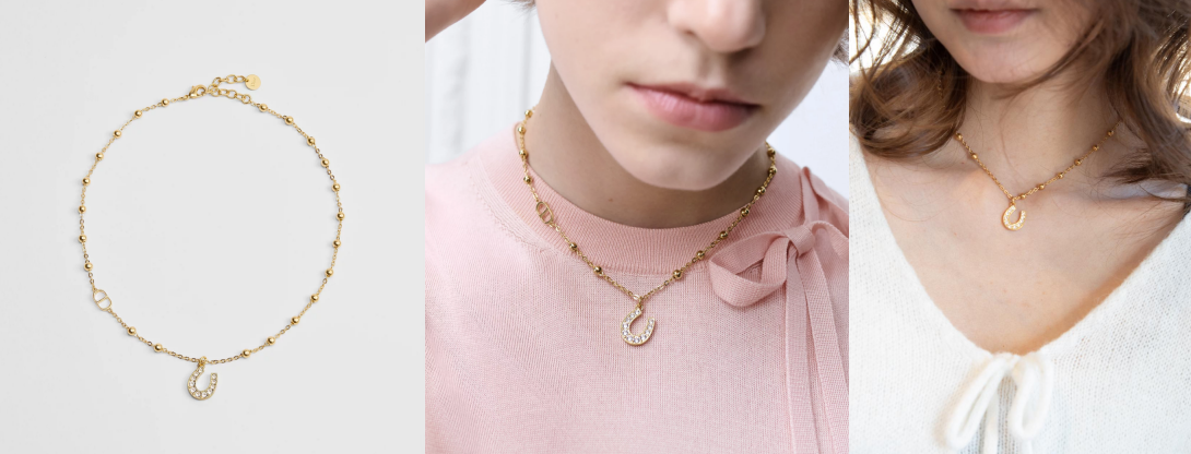 图注:Lucky Dior项链(产品编号:N3631WOMCY_D03S),纤细珠饰链条搭配密镶水晶马蹄铁吊坠,是点亮锁骨间的优雅开运符。