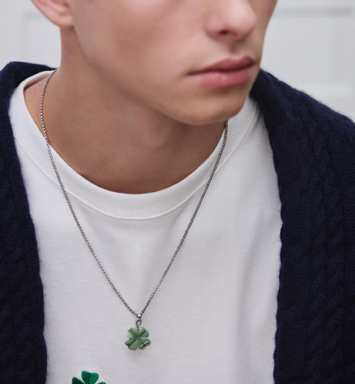 设计亮点:由创意总监乔纳森·安德森(Jonathan Anderson)设计,将DIOR经典的四叶草(Trèfle)符号注入生机。吊坠以绿色人工树脂打造叶片部分,镶嵌于银质底座,色彩对比鲜明却不过分张扬。链条饰有Dior标志金属饰牌,提升整体辨识度。