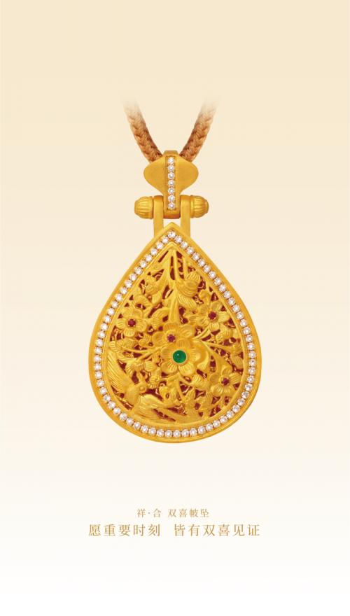 和美金帔系列的设计灵感,深植于宋代“凤冠霞帔”的婚嫁礼制,尤其聚焦其中承载誓约的“金帔坠”。品牌设计团队以现代设计语言,对这份厚重的东方美学遗产进行了一次大胆而精妙的“转译”。系列作品将鸳鸯、双喜、莲运等经典祥瑞意象,凝练为极致简约的线条与符号,并借助古法花丝、錾刻等非遗技艺,使黄金呈现出前所未有的轻盈与灵动。这恰好与西安这座城市的气质不谋而合——在厚重的历史肌理上,生长出充满活力的现代都市节奏。