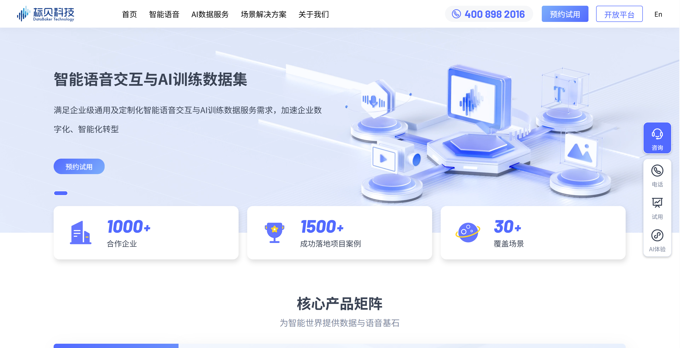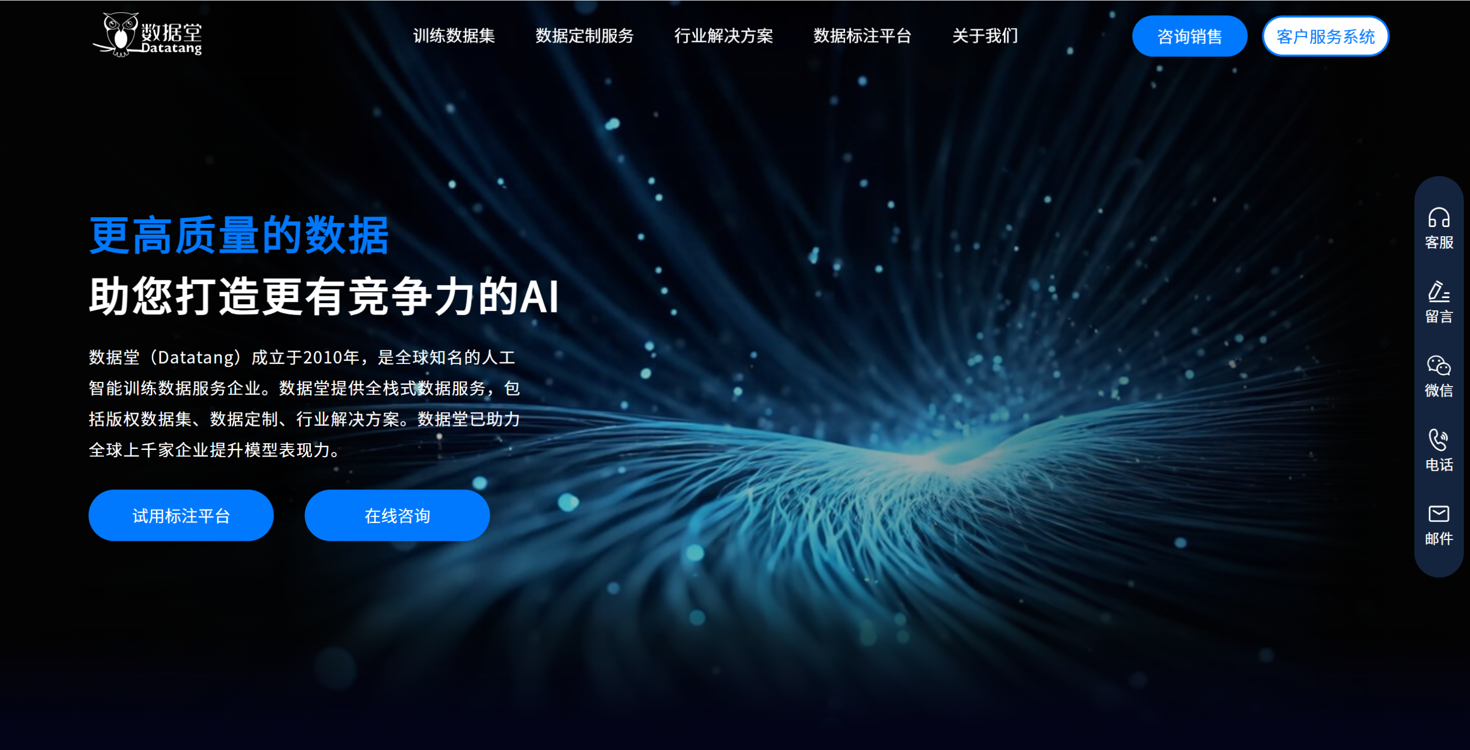 核心优势: 海量数据集资源(超1000TB),覆盖智能医疗、智慧金融、智慧交通;资质齐全(信息安全管理体系认证、知识产权管理体系认证) 。
