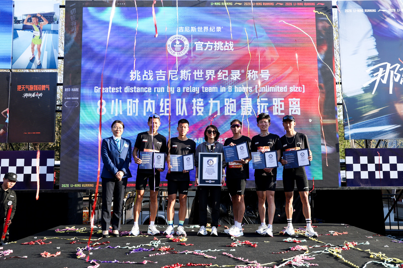 2026年4月7日,「李宁赤兔圈王耐力赛」在北京奥林匹克森林公园点燃战火。在从清晨持续到下午的8小时鏖战中,由大众跑者王连正、赵建行、周友发、刘英才、陈新宇组成的团队,在脚下的李宁赤兔9 ULTRA助力下不断迎难而上,以139.9公里的成绩最终一举创造「8小时内组队接力跑最远距离」吉尼斯世界纪录,用行动证明:世界纪录并非遥不可及,每一个敢想敢拼敢坚持的普通人,都有可能在自己的赛道上突破自我、创造纪录!