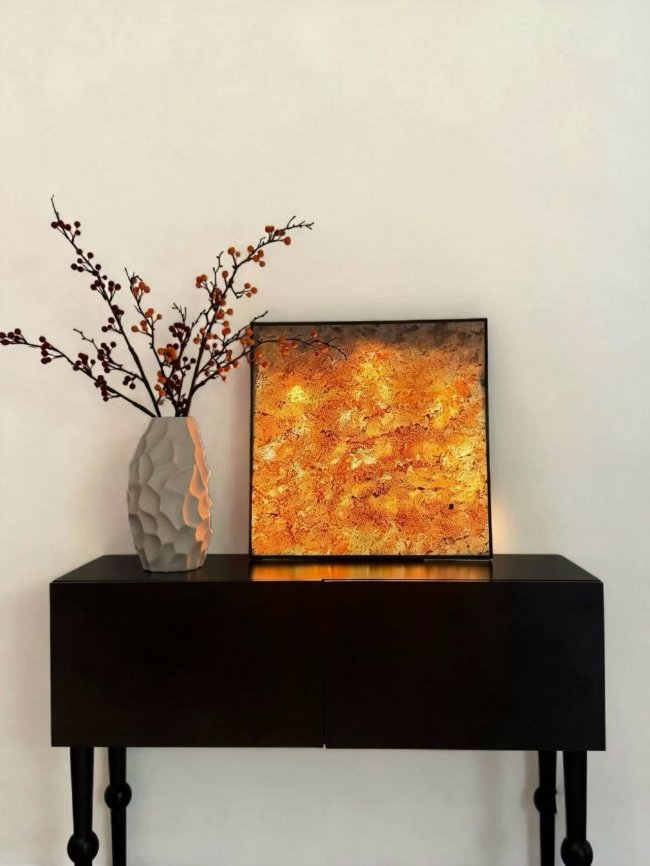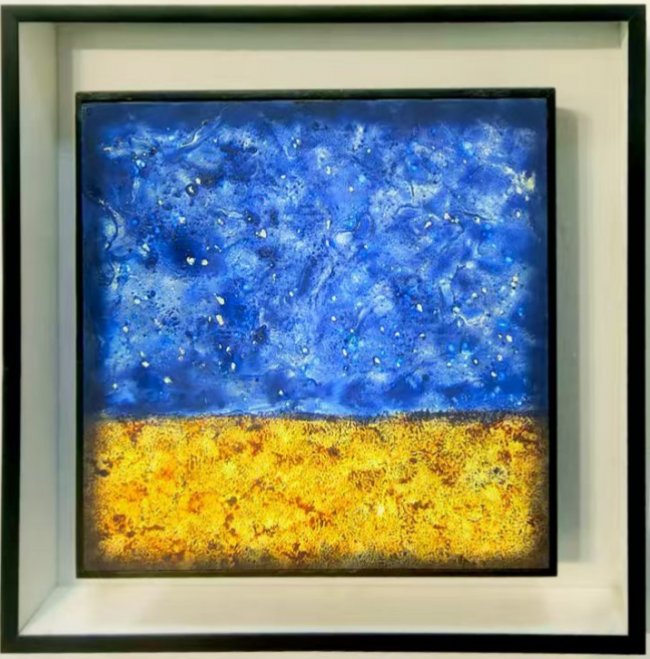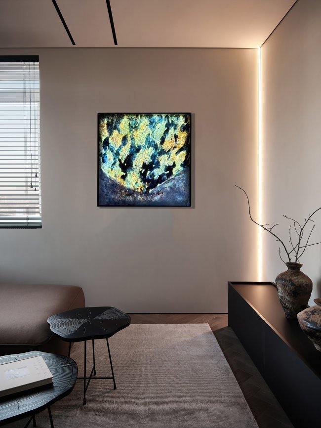 《碧渊》以翡翠绿奢石为基底,纹理深邃如渊,荧光点缀如星尘沉落;《金是坠落的星》以深蓝为底色,金色纹路如星云流转,将黄金源自宇宙星尘的地质概念融入视觉表达,以自然肌理承载东方哲思,在平面之上构建出富有时空感的艺术场域。